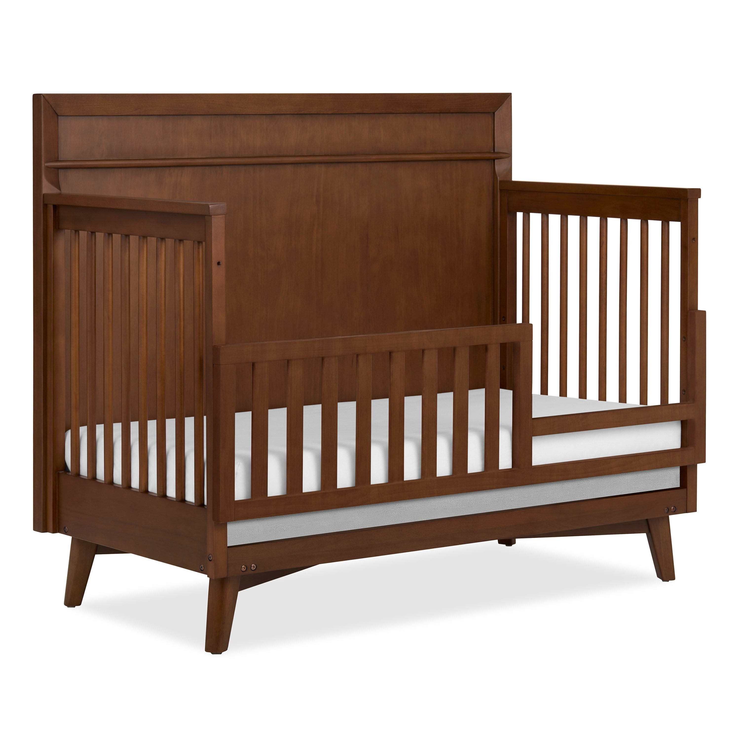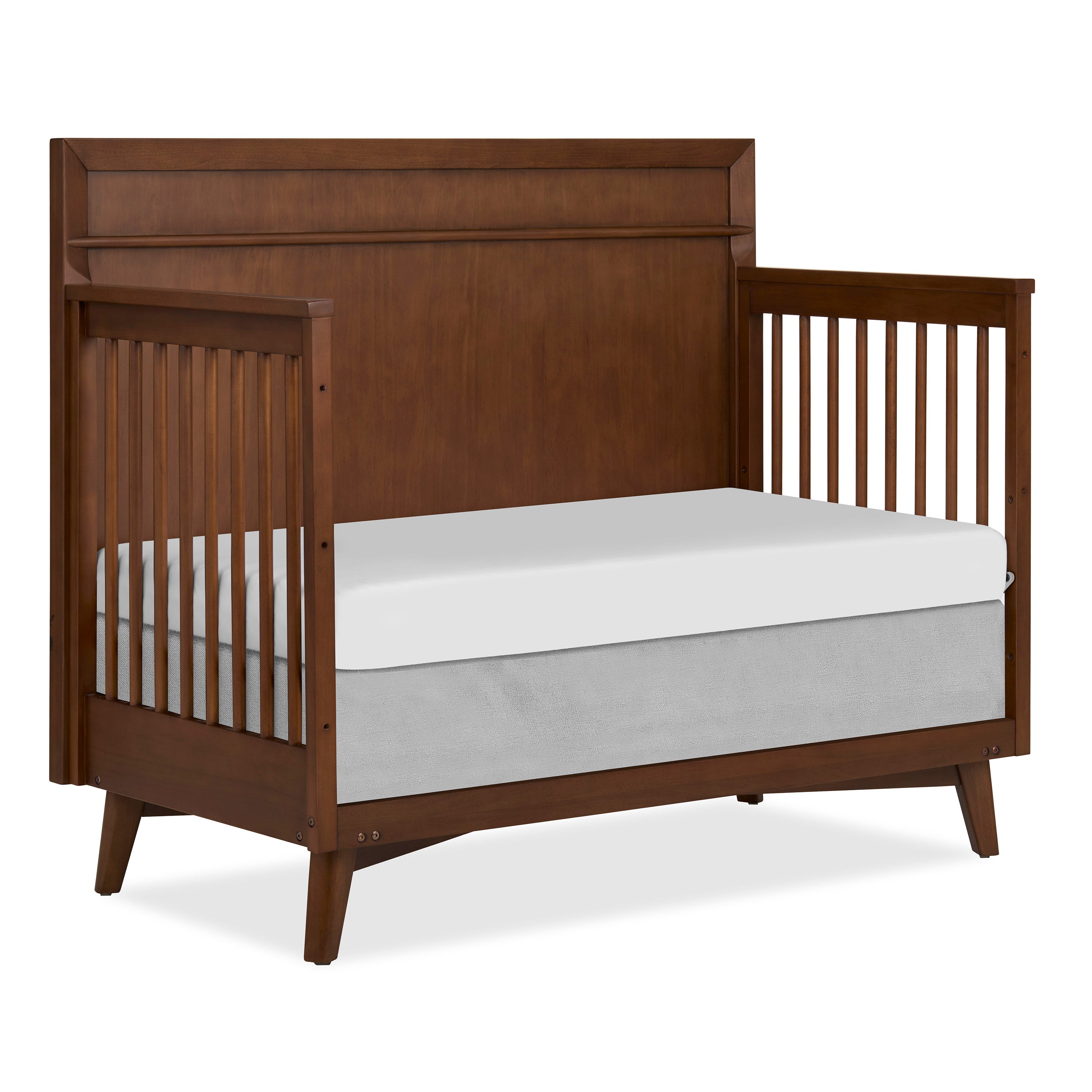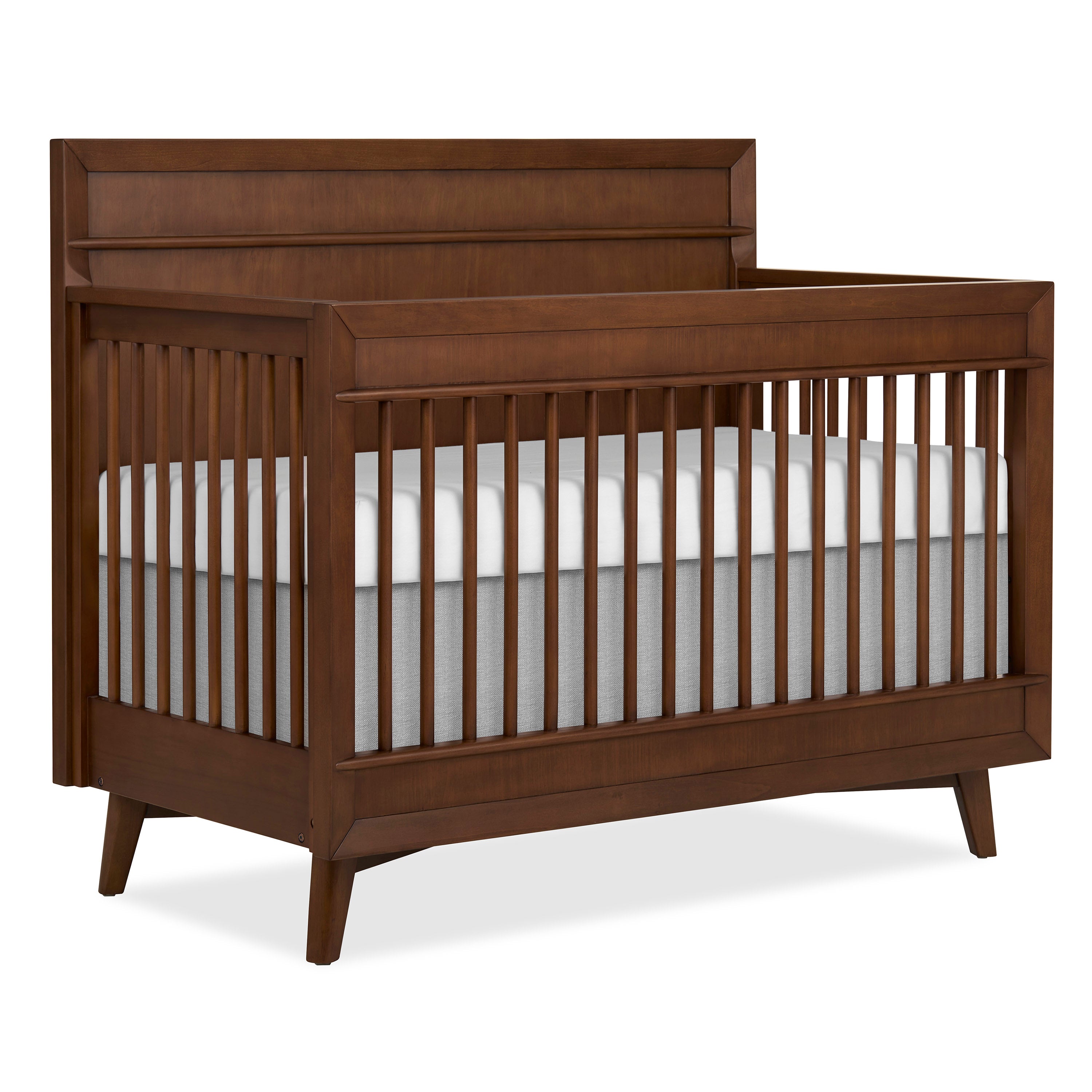 A statement piece that blends rich wood texture with clean, modern design. The crib transitions from crib to toddler bed, daybed, and full-size bed (conversion kits sold separately).